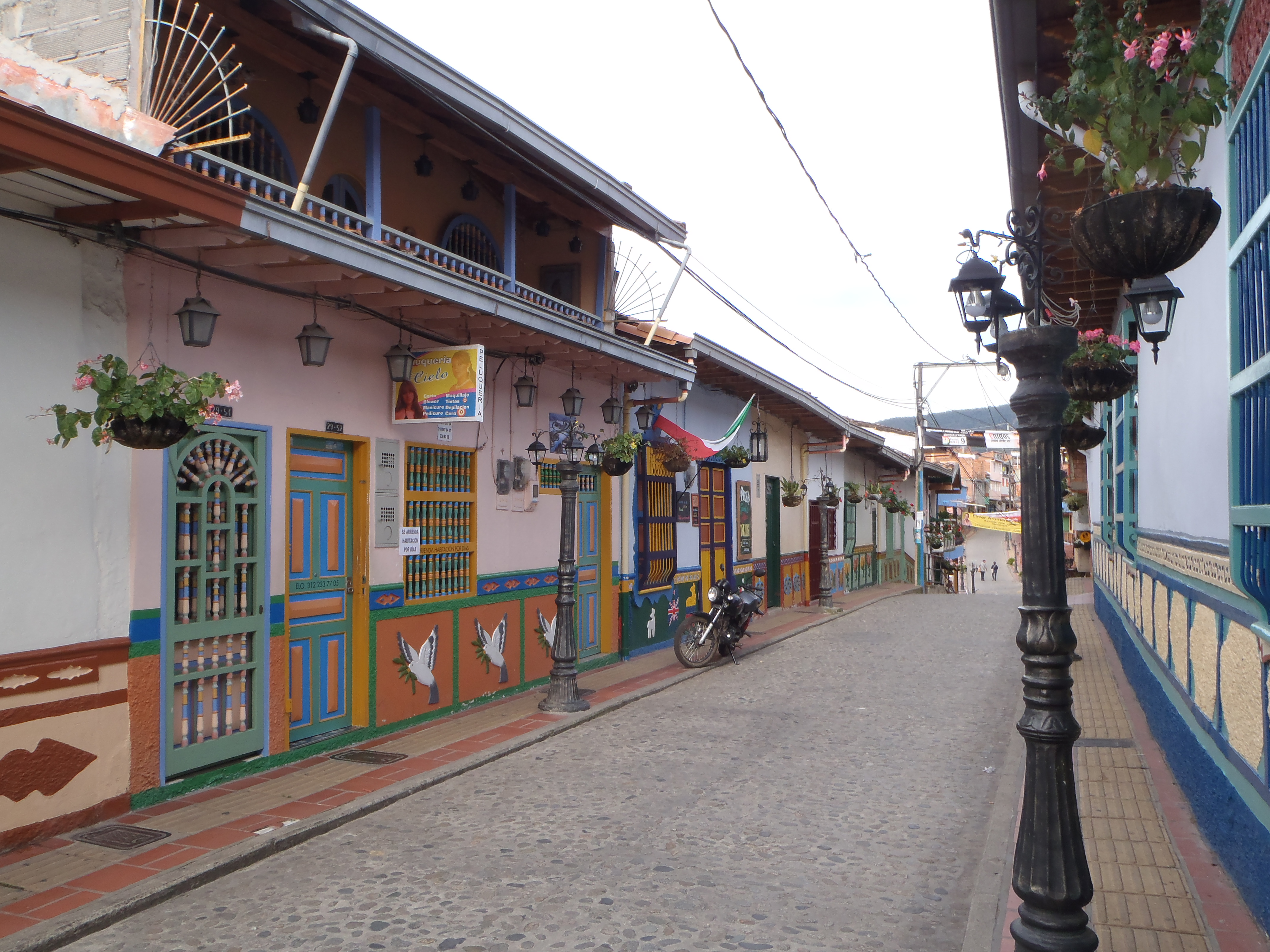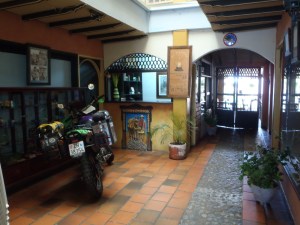 Our enjoyable ride was rewarded by an even more enjoyable sight once we entered Guatape. After finding the hotel and being told must park my bike in the reception I went about trying to get my bike into the reception. This was not as easy as it sounds. The small cobbled street had a step down on a sunken sidewalk which was quite narrow and the entrance to the hotel had a step up. I could not ride my bike along the sidewalk and turn it into the hotel as the turn was too tight and I was worried my panniers would bash the narrow door, it was a VERY tight fit. So I had to enlist the help of the butcher next door much to the amusement of his wife and daughter the two of us struggled with no co-ordination between us (due to lack of using the same language) to push and pull my bike into the hotel. A small crowed had gathered and we all just ended up in tears of laugher. Who needs communication when you have sign language 🙂