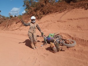 SO off we go and wow it was great to be back on my bike riding in the dirt again. I had to keep the bike running all day even when we filled up, as it needed to be jump started if it stopped. Peter and I made some great time. I took it easy as we couldn’t afford to have a flat or an accident or anything. I really enjoyed the day, until the bull dust. OMG I have never encountered this stuff it is like brown talcum powder and nothing like riding river sand at all. If the layer is very thin you can ride it by just getting your weight slightly back and accelerating just a touch. So no problem I’m doing well and enjoying myself until I hit a huge patch of this stuff and my bike just starts snaking all over the road, I’m standing up so almost go over the handlebars and end up on the opposite side of the road thinking ‘’WOW what a ride man. What great riding, damn why isn’t there someone with a go pro filming this’’ I was so proud of myself so patted gadget and headed off again. Not 300m later and the same thing again, this time the bull dust if up to my axel and the next minute I’m on the ground. I have to say it was very slow motion gently fall as no one guns it through bull dust. The worst outcome is that gadget stalls.