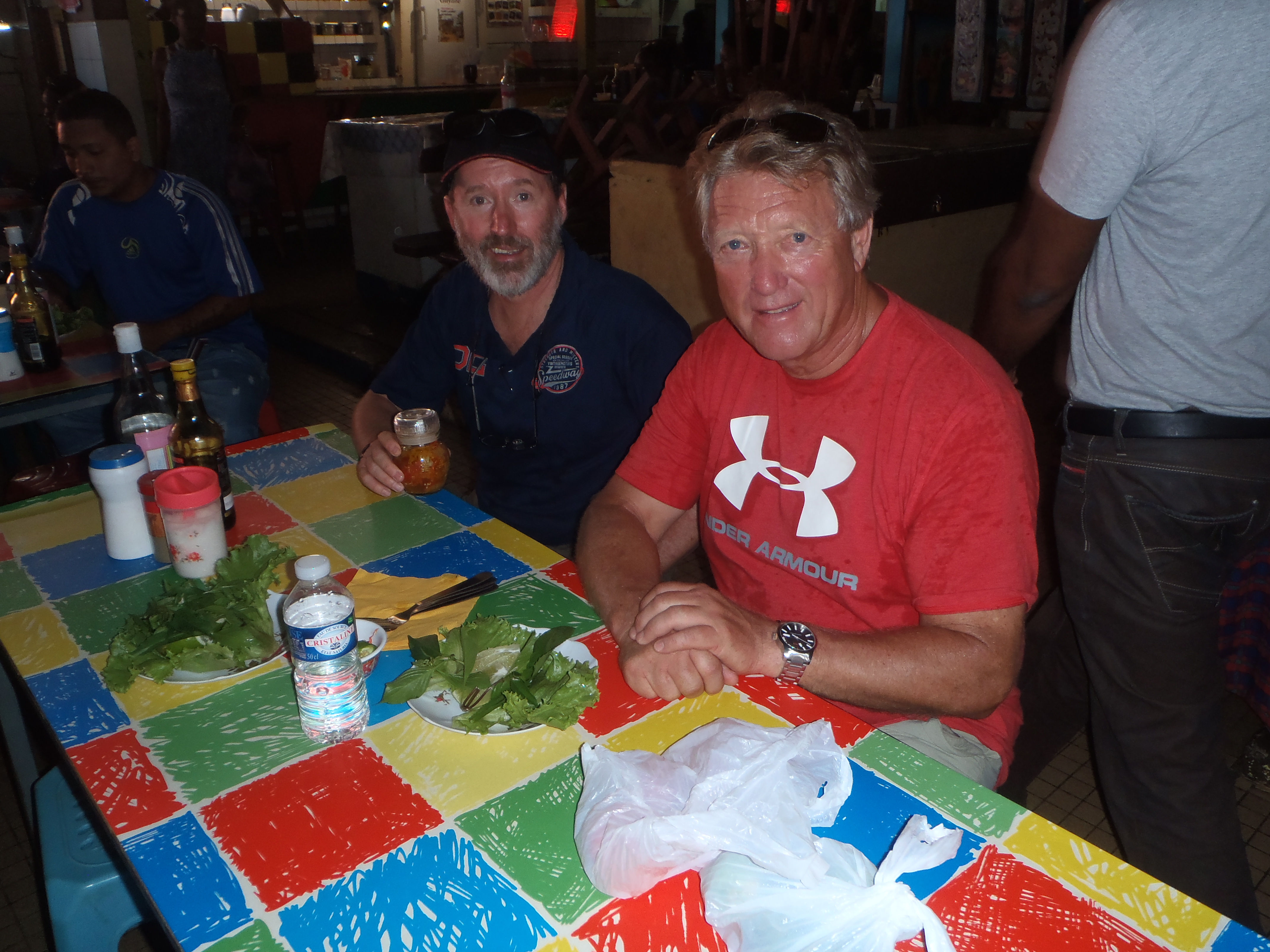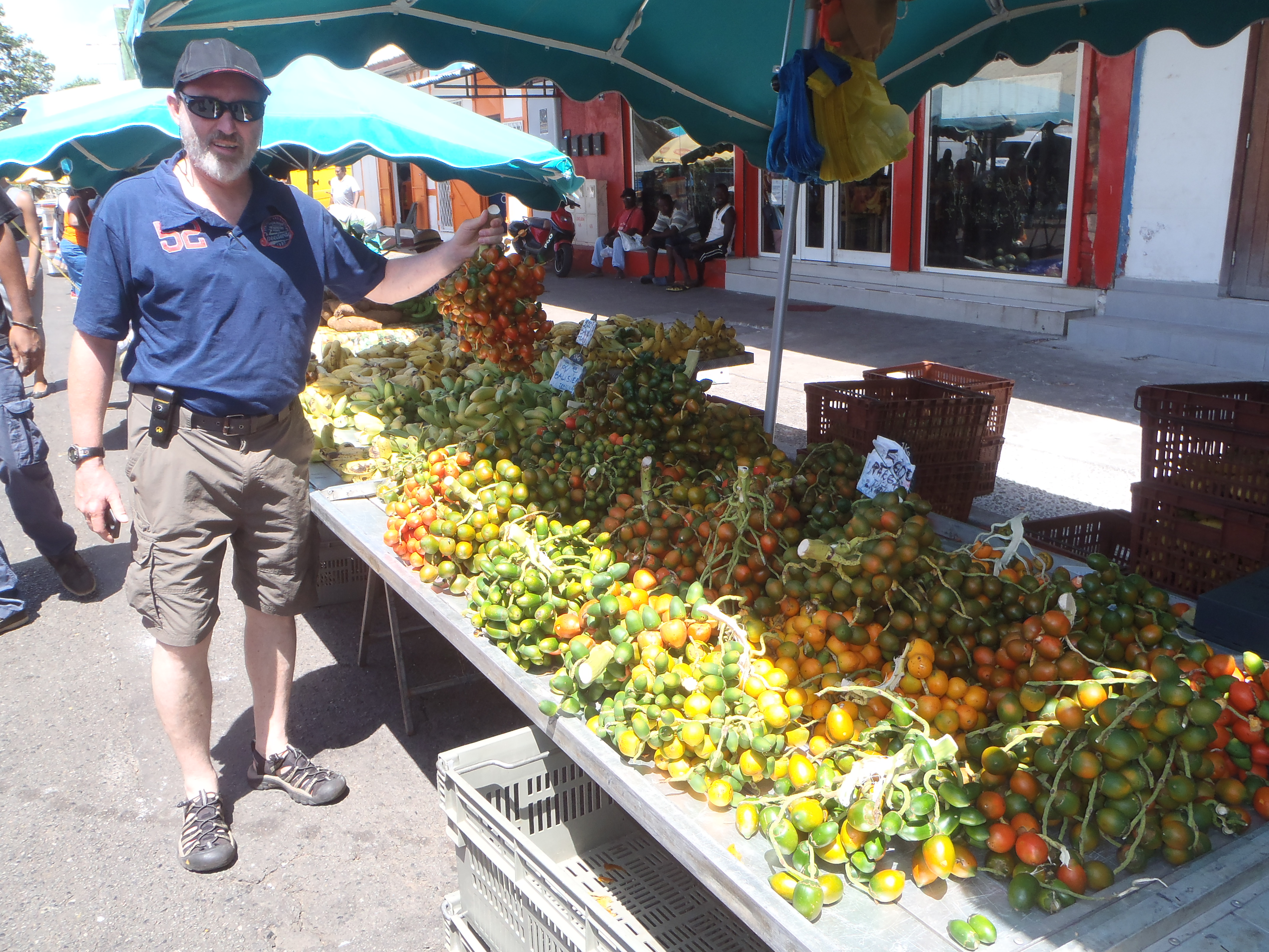 Cayenne itself is a nice city but not as nice as Paramaribo in Suriname (I’ll explain later) it did have great restaurants and it was such a pleaser to have some different food. All the food in S America has been good, no complaints, but this was great. One can see the whole city in half a day so we needed to find stuff to do as we were there for 2 full days. SO the following day we went to see the market, nice and interesting not full of dead animals or live ones stuffed in tiny cages, but loads of vegetables many of which I did not recognise. Plus a great Vietnamese food vendor and a fresh fruit stall, again with the gooooooood food.