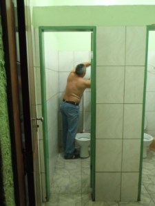 Amazon Rambo Rubem at his night job fixing toilets and helping bikers