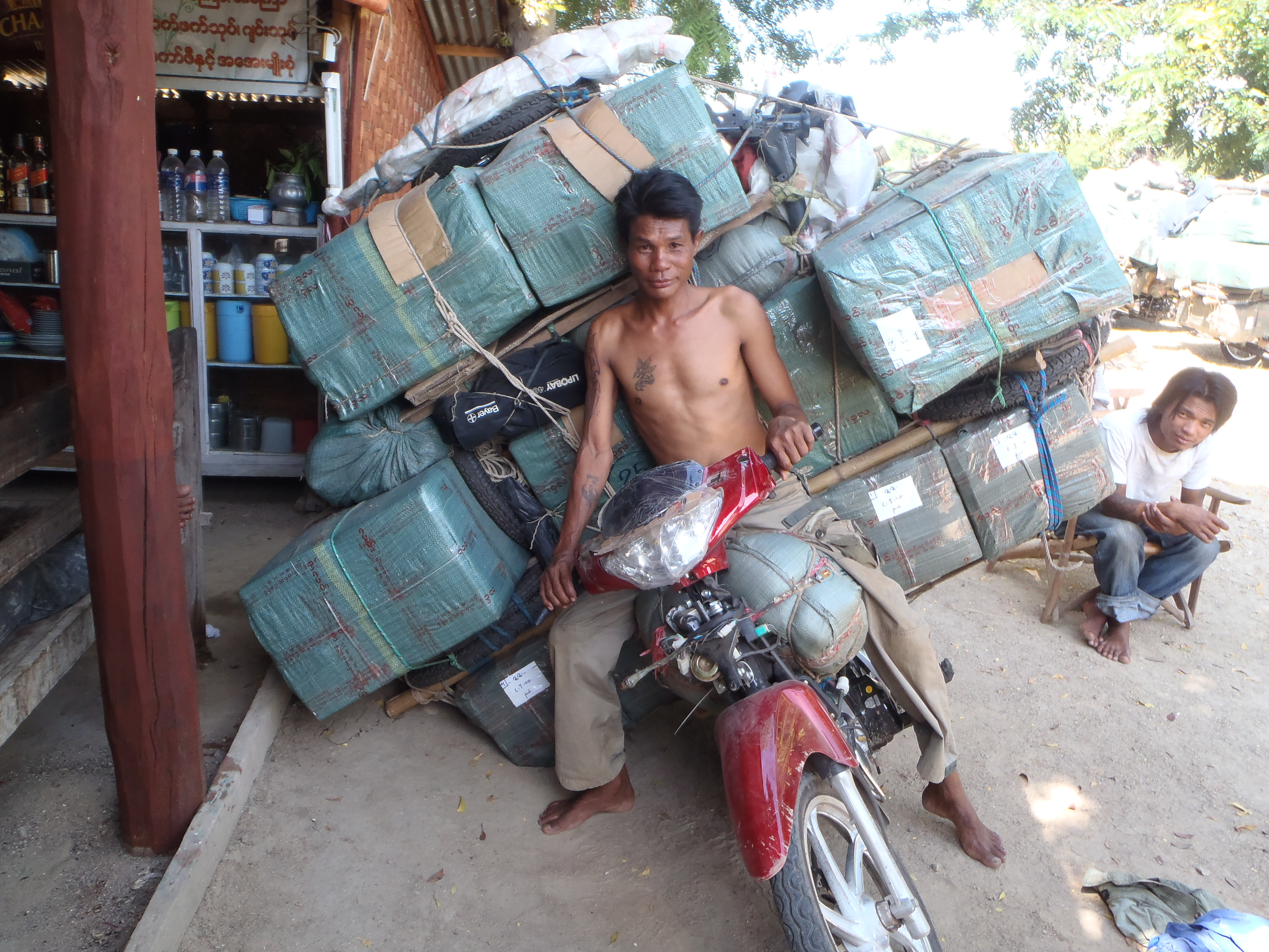 Like any county I have travelled through I saw some wonderful things on the road, the scooters piled up with all sorts of things and people. Well in Myanmar we saw them take this to the next level, when we came across a group of scooters transporting a number of brand new in the box scooters to the next town. We came across this sight at a small roadside restaurant where the drivers had stopped for a rest. They told us (it never cesses to amaze me just how many people in Myanmar speak English) that each scooter was carrying 4 new scooters packed up in the boxes, engines wheels and all. How these riders did this I will never know but they are very strong men.